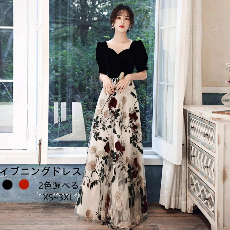 ロングドレス イブニングドレス パーティードレス ベロア ベルベット 刺繍花柄 パフスリーブ/半袖 Aライン 成人式 発表会 結婚式二次会にお呼ばれ おしゃれ ドレス イブニングドレス パーティードレス ロング 黒 ベロア ベルベット